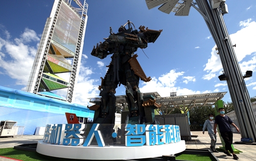 A robot model rises above the outdoor exhibition area near the China National Convention Center, where the China International Fair for Trade in Services will be held in the Beijing Olympic Park in Beijing, capital of China, on Sept 3, 2020. [Photo by Zhang Wei/chinadaily.com.cn]