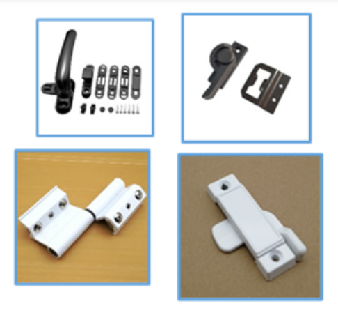 三、门五金:不同窗型的五金:铰链、把手、风撑、平头插销、推拉窗滑轮、中锁、滑动拉杆锁、传动杆等。海关编码:8302.10.00.900、8302.41.00.390、8302.41.00.340、8302.20.00.900、8302.41.00.900、8302.41.00.190、8301.60.00.900、8302.41.00.320。(材质:塑料、 镀锌钢、锌合金、铝)