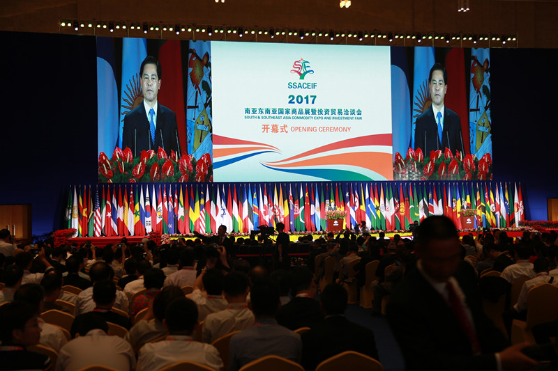 “2017南亚东南亚国家商品展暨投资贸易洽谈会”由云南省人民政府、中国-东盟中心同主办,主题为“共创新机遇,共谋新发展”。商务部部长助理李成钢,中国贸促会副会长、中国国际商会副会长卢鹏起,国家海洋局、全国人大财经委、部分省市区领导及南亚、东南亚和其他相关国家和地区的政府机构、工商界和国际组织的嘉宾出席了会议。本次商洽会展览部分共设17个展馆,8000个标准展位,“一带一路”沿线33个国家和地区,全球86个国家和地区,4000多家企业参展参会,境外企业占比达41.2%。