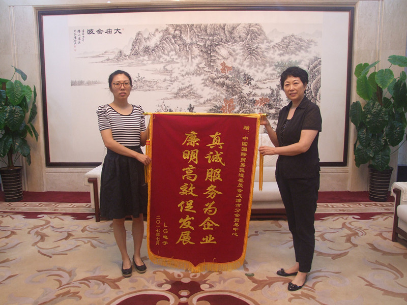 乐金电子(天津)电器有限公司负责人孔力力在赠送锦旗时说:“贸促会工作人员服务热情周到,细致入微。签证员严谨的工作作风,对工作认真负责的态度,把我们当亲人,主动为我们排忧解难,令我们深受感动”。