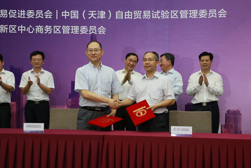 中国贸促会副会长卢鹏起(前排左一)与天津自贸试验区管理委员会专职副主任张忠东(前排右一)代表双方签约