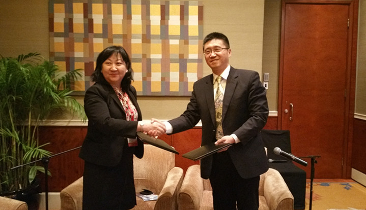 段益民副会长(右)与玛•乌云其米格会长(左)互换合作备忘录