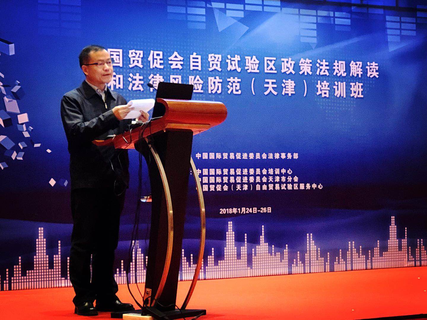 2017年1月24-26日,“中国贸促会自贸区最新政策解读暨经贸摩擦预警培训会”在我市中心生态城希尔顿酒店成功举办,我会祖大祥会长、市商务委黄春艳副主任、中国贸促会法律事务部刘超副部长等领导出席并致辞。培训会由中国贸促会天津自贸区服务中心执行主任冷海东主持,天津自贸区管委会派员参会指导,来自全国十一个自贸区、各地贸促分会代表及相关外向型企业代表180人参加了培训。