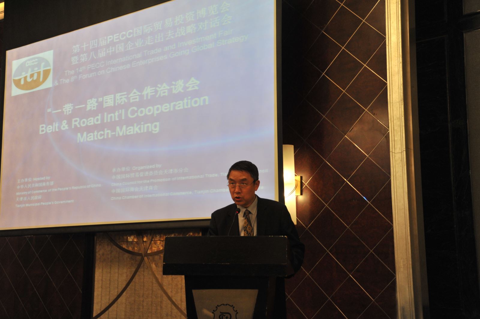 4月13日下午,由我会举办的第十四届PECC国际贸易投资博览会暨第八届中国企业“走出去”战略对话会专场活动-“‘一带一路’国际合作洽谈会”在天津瑞吉金融街酒店举行,我会赵峰副巡视员出席并致辞。来自亚洲、欧洲、美洲、非洲近20个国家的代表与我市相关企业代表共500余人参加了会议。