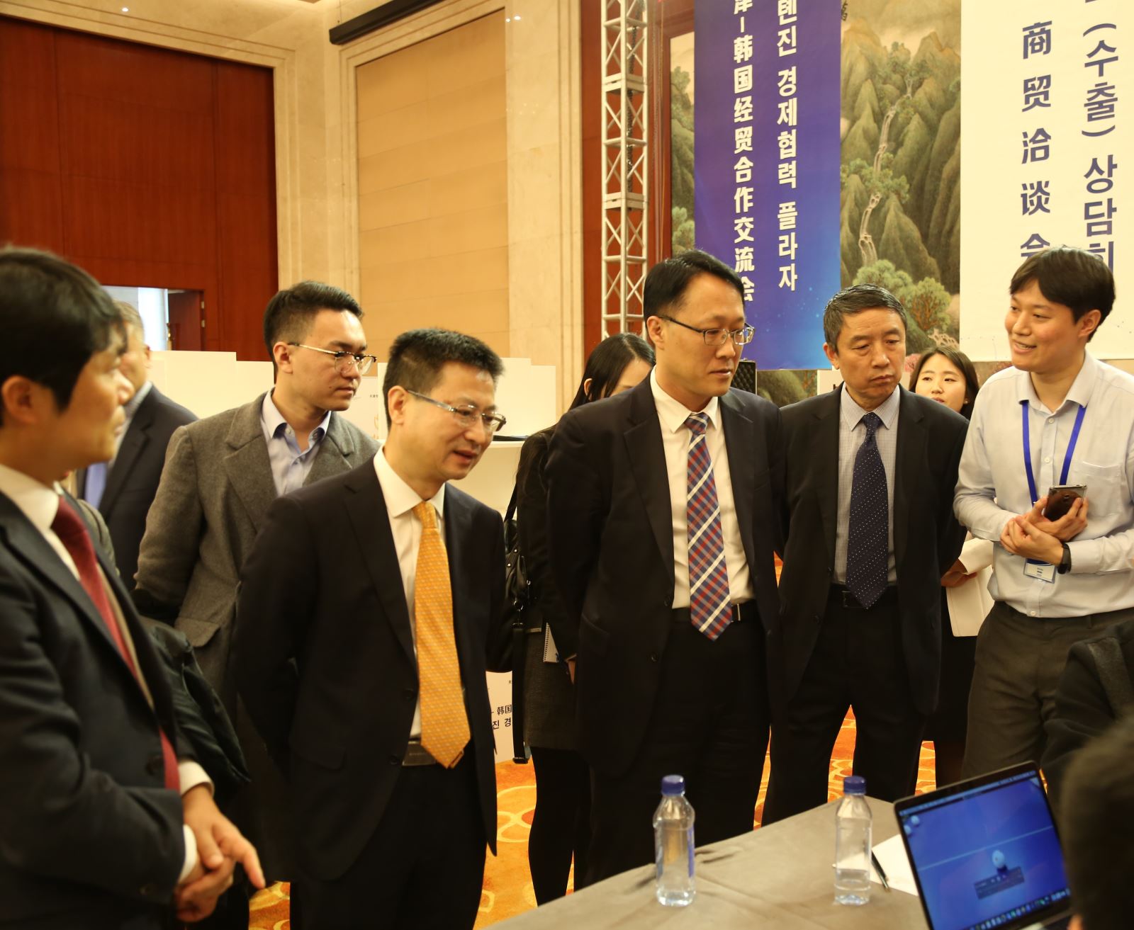 康义副市长(左二)、韩国经济公使白龙天(中)、赵峰副巡视员(右二)视察洽谈现场