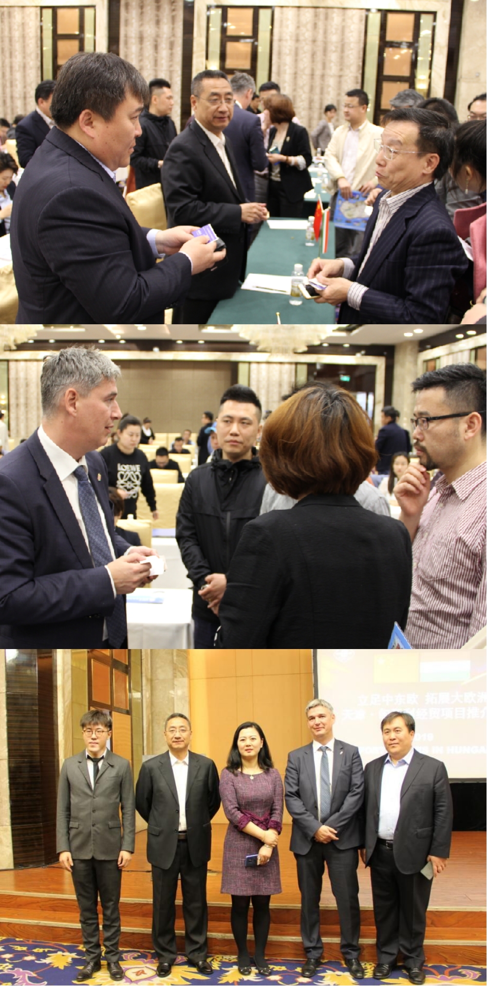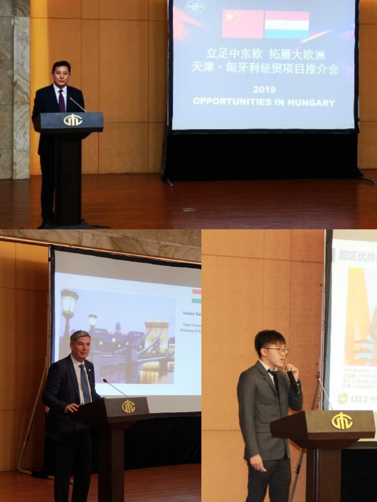 上:戴胜国副巡视员致辞 左:匈牙利大使馆商务参赞演讲 右:匈牙利中欧商贸物流合作园区副总演讲