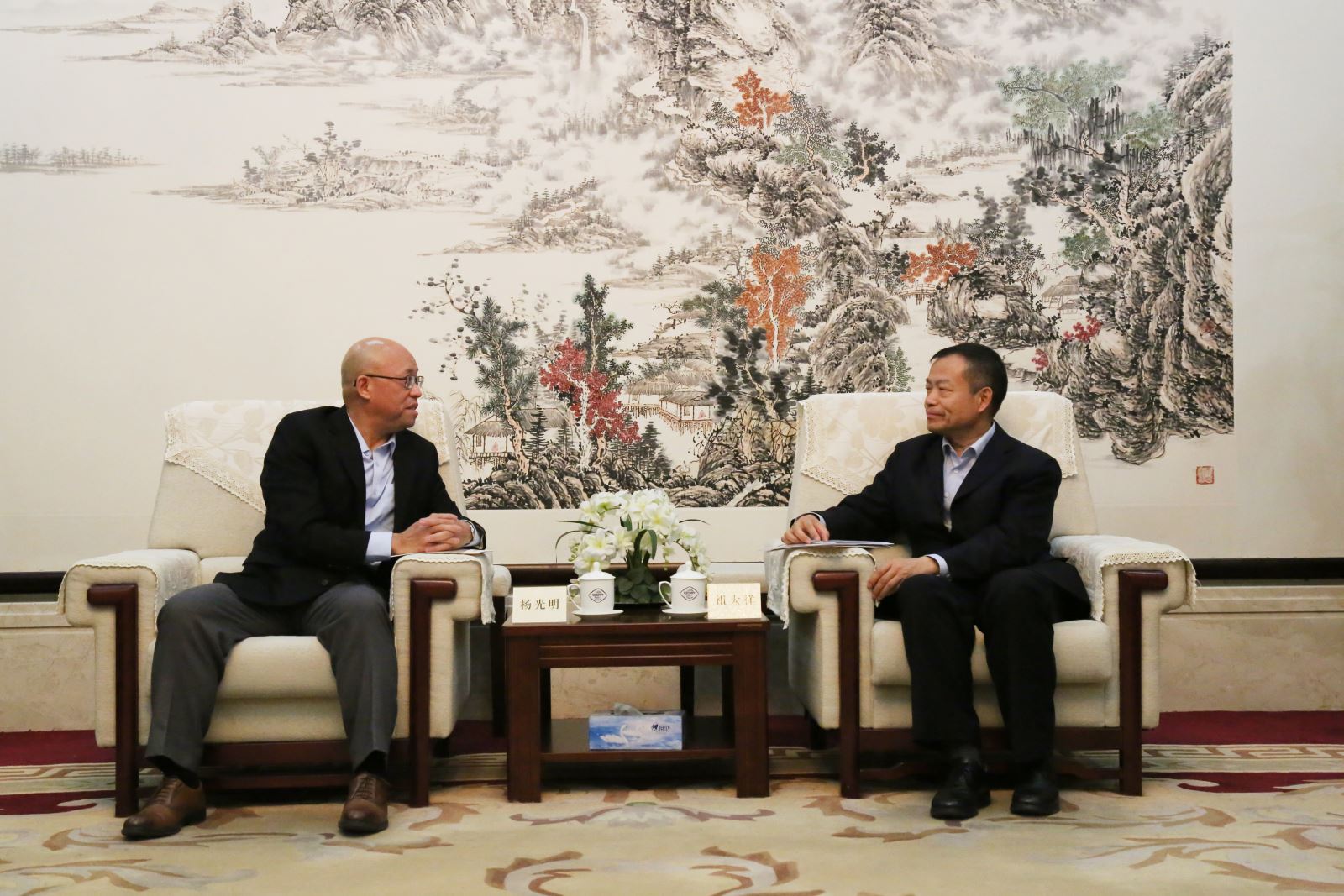 12月17日下午,祖大祥会长会见台北世贸中心北京代表处首席代表杨光明一行。办公室、世贸中心负责同志陪同会见。