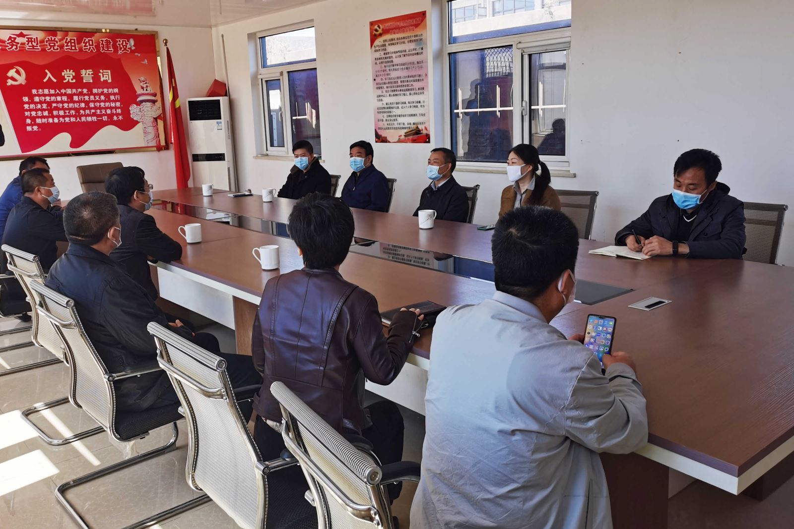 吴承明(左三)与蓟州区人社局、社保中心沟通困难村就业创业情况
