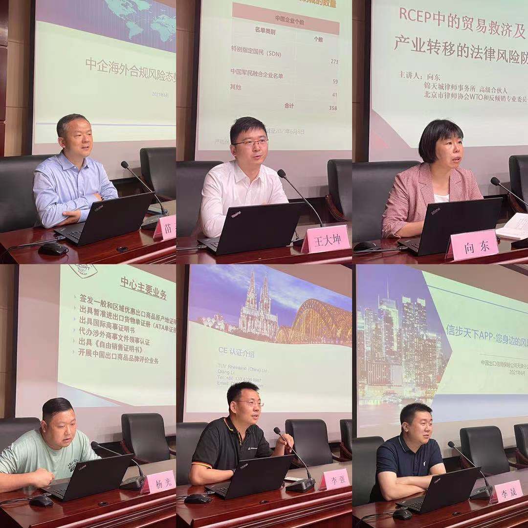 中国贸促会专家顾问围绕中企国际化经营合规风险挑战与应对、RCEP贸易救济规则及中企产业转移风险等议题进行了培训,我会商事认证中心、德国莱茵集团、天津出口信用保险公司等分别介绍了商事认证、欧盟CE认证、出口信用保险方面的服务内容和惠企举措。