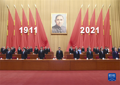 人民大会堂大礼堂气氛庄重热烈。主席台上方悬挂着“纪念辛亥革命110周年大会”会标,后幕正中是孙中山先生画像,10面红旗分列两侧,上面悬挂的“1911”“2021”字标格外醒目。