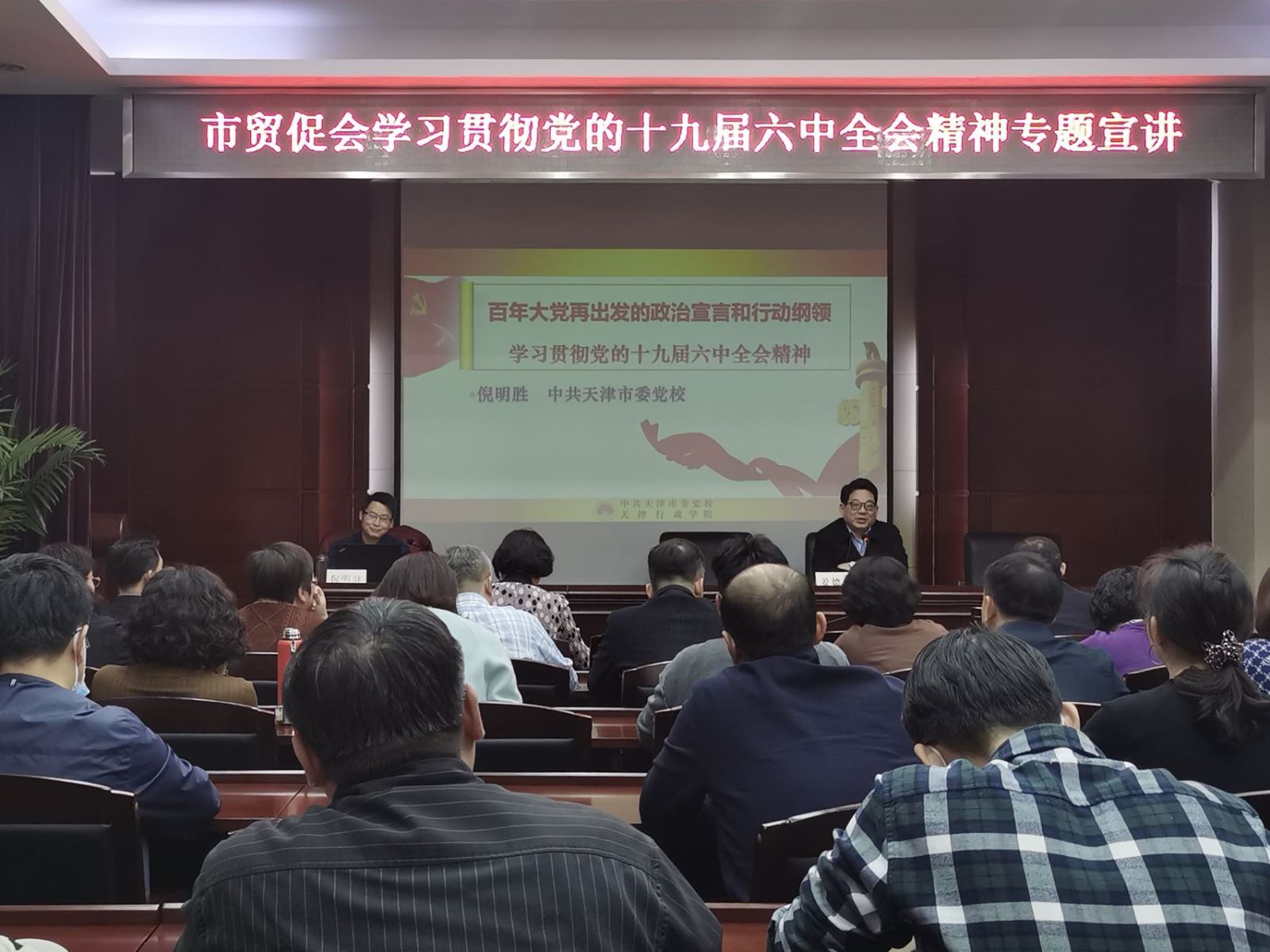 为深入学习贯彻党的十九届六中全会精神,12月15日下午,市贸促会召开学习贯彻党的十九届六中全会精神专题宣讲会,市贸促会党组书记、会长姜德志主持会议,天津市委党校倪明胜教授做宣讲辅导,市贸促会全体党员干部职工参加会议。