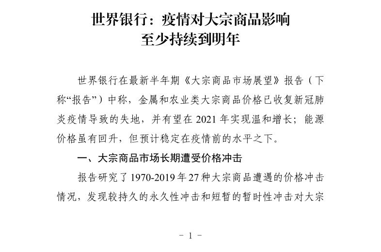 贸促工作参考——世界银行:疫情对大宗商品影响 至少持续到明年