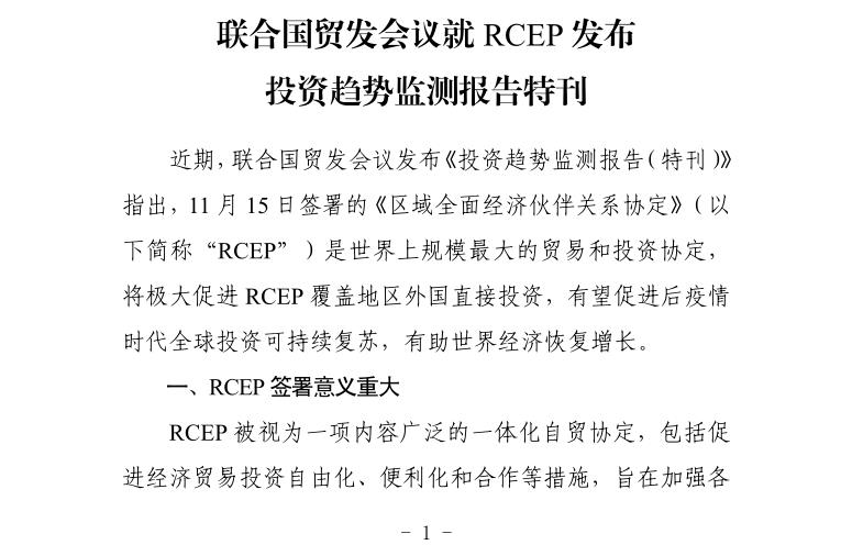 贸促工作参考——联合国贸发会议就 RCEP 发布 投资趋势监测报告特刊