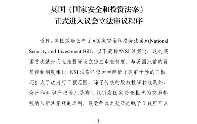 贸促工作参考——英国《国家安全和投资法案》正式进入议会立法审议程序