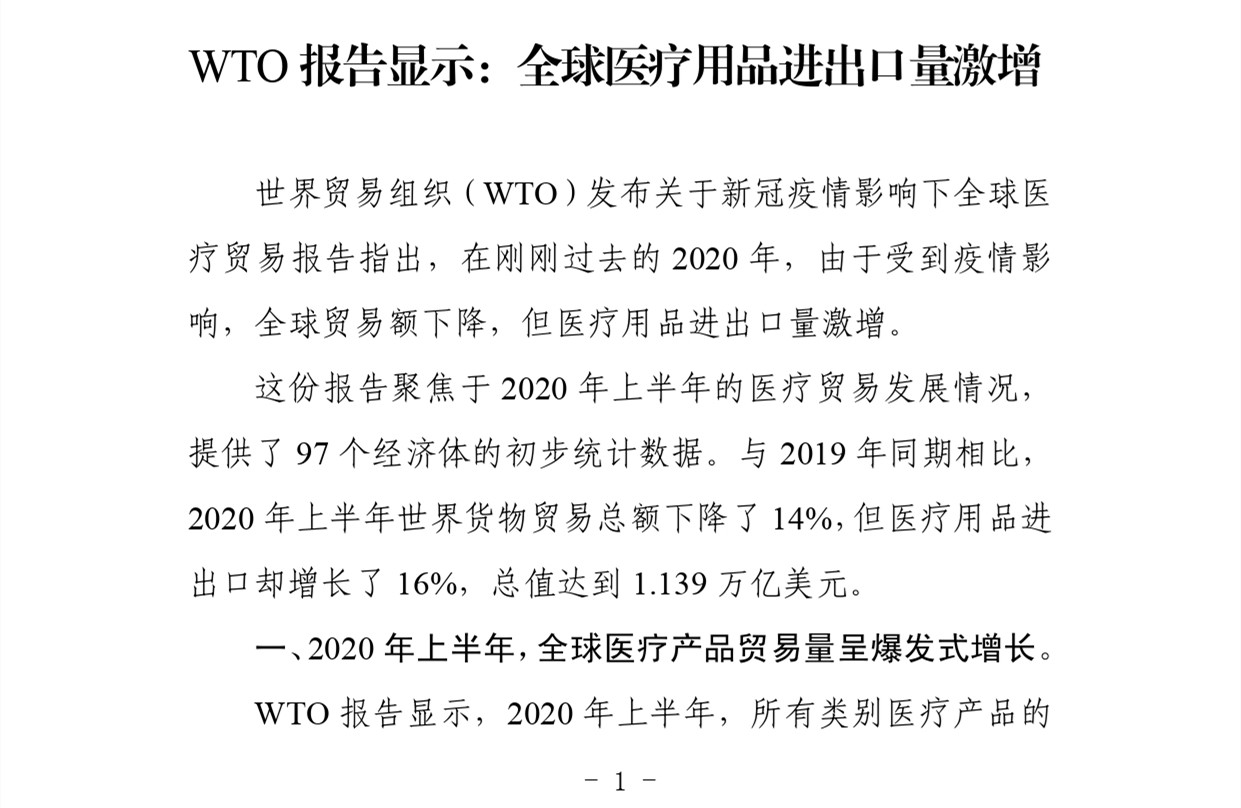贸促工作参考——WTO 报告显示:全球医疗用品进出口量激增