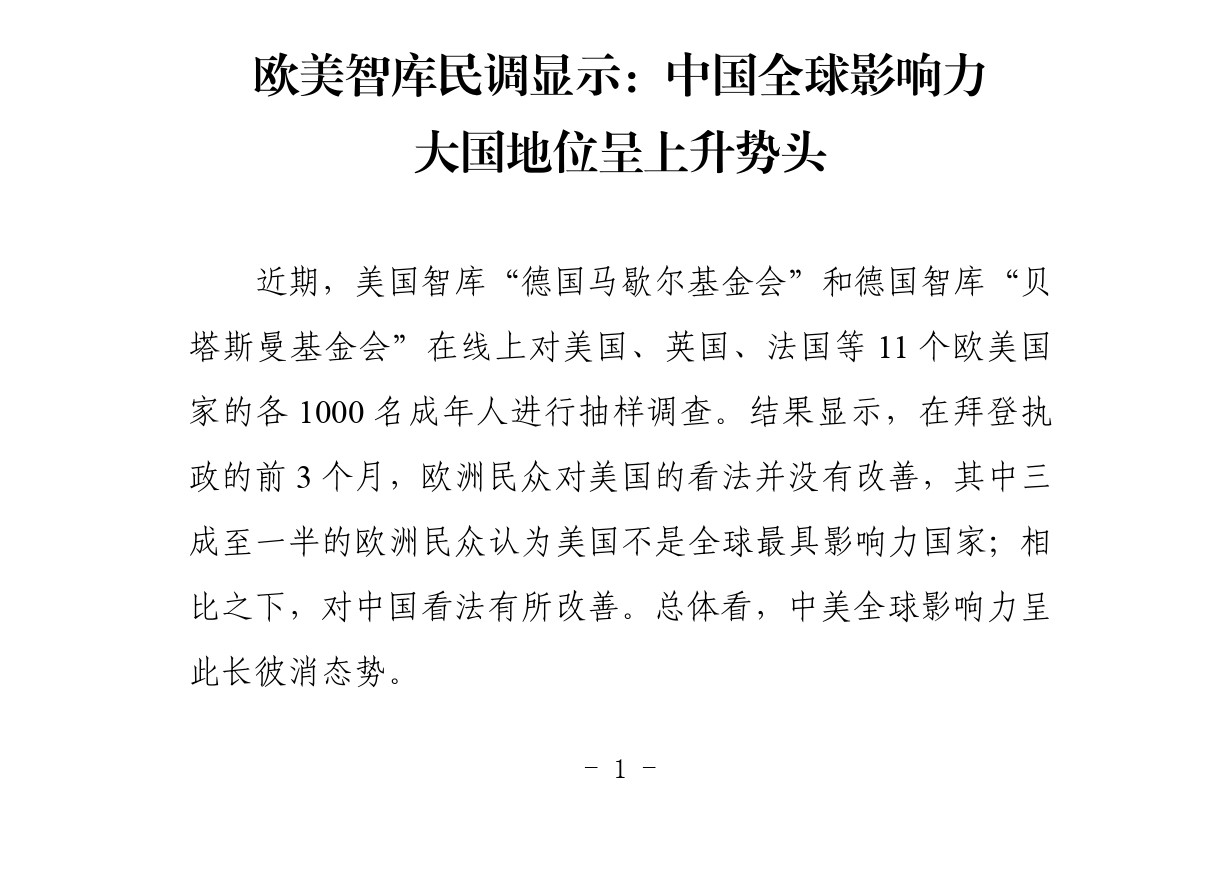 贸促工作参考——欧美智库民调显示:中国全球影响力大国地位呈上升势头