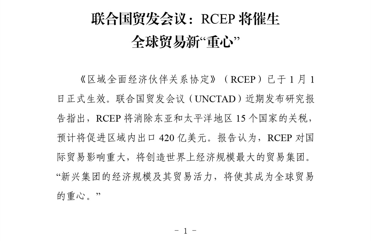 贸促工作参考——联合国贸发会议:RCEP 将催生 全球贸易新“重心”