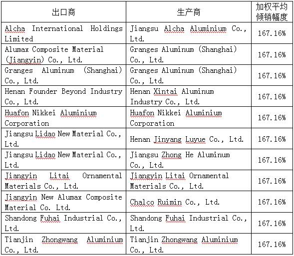 2018年6月18日,美国商务部宣布对进口自中国的铝合金薄板(Alloy Aluminum Sheet)作出反倾销初裁,初步裁定:强制应诉企业河南明泰铝业股份有限公司(Henan Mingtai Al Industrial Co., Ltd.)和郑州明泰实业有限公司(Zhengzhou Mingtai Industry Co.,Ltd.)、南杰资源有限公司(Nanjie Resources Co., Limited)、永杰新材料股份有限公司(Yong Jie New Material Co., Ltd.)、浙江永杰铝业有限公司(Zhejiang Yongjie Aluminum Co., Ltd.)、Zhejiang GKO Aluminium Stock Co., Ltd.、获得单独税率的企业(详见下表)以及中国其他企业倾销率均为167.16%。美国商务部预计将于2018年10月30日对此案作出反倾销终裁。
