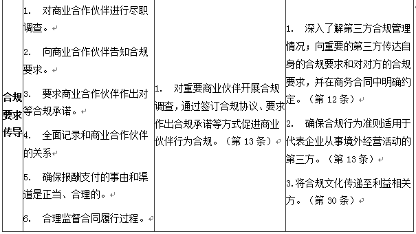 《世行合规指南》列举了雇佣前尽职调查、限制雇佣前政府官员、管控礼品招待支出、政治捐款限制、慈善捐赠和赞助、好处费、完整记录和欺诈、串通舞弊和胁迫等八个领域作为合规体系建设的重点。值得关注的是,《世行合规指南》进一步要求企业将诚信合规义务延伸到商业伙伴。