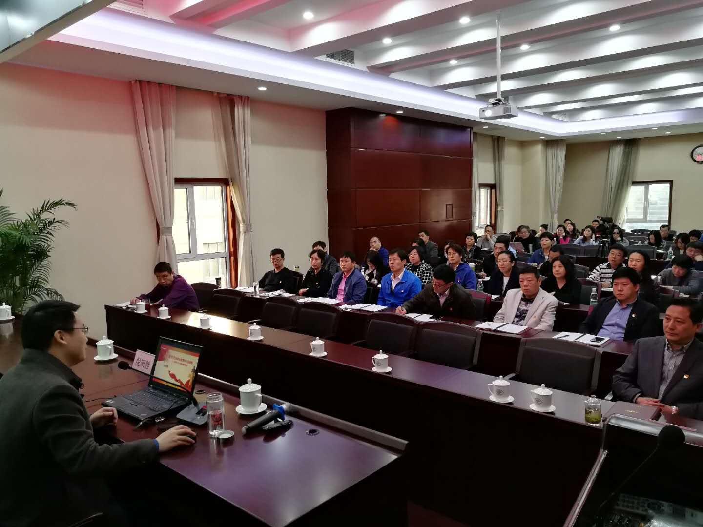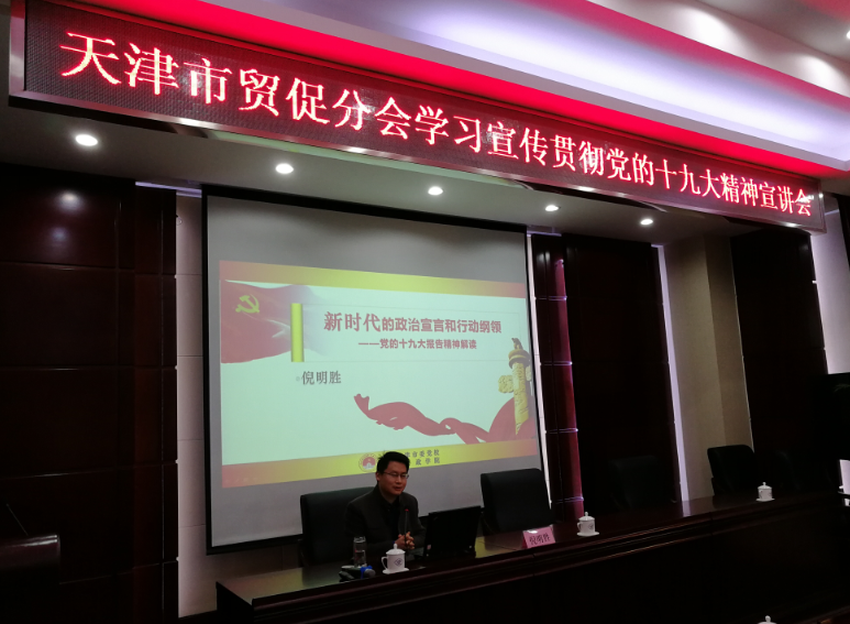 2017年11月16日,天津市贸促分会邀请市委党校倪明胜副教授为全体党员干部职工做十九大精神专题辅导报告。会议由天津市贸促分会机关党委书记戴胜国主持。
