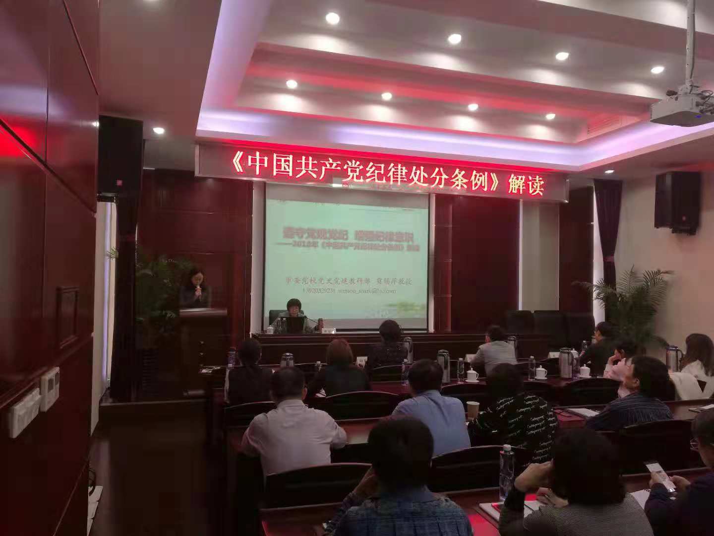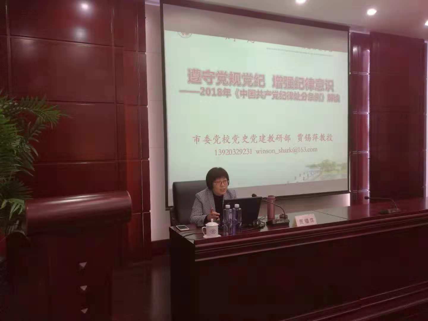2018年11月15日,天津市贸促会举办了2018版《中国共产党纪律处分条例》专题辅导讲座,邀请天津市委党校贾锡萍教授为我会处级以上干部、全体党员、入党申请人和挂甲寺街共建单位代表进行了深入细致的宣讲解读。