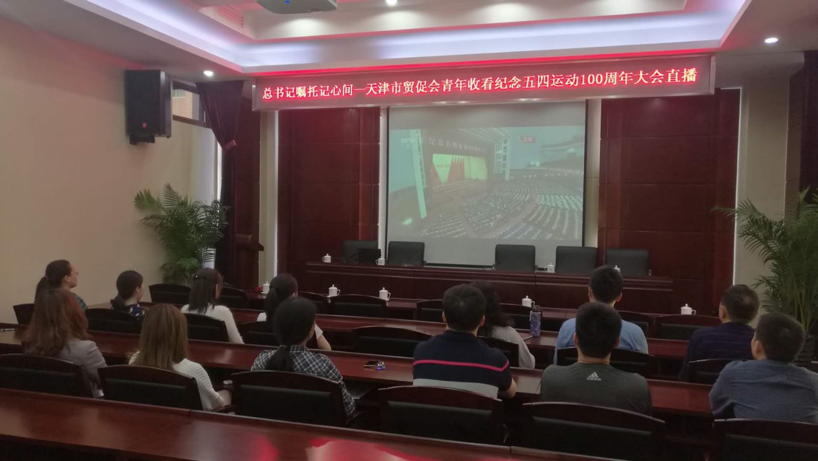 4月30日上午,天津市贸促会青年干部职工集中观看纪念五四运动100周年大会。