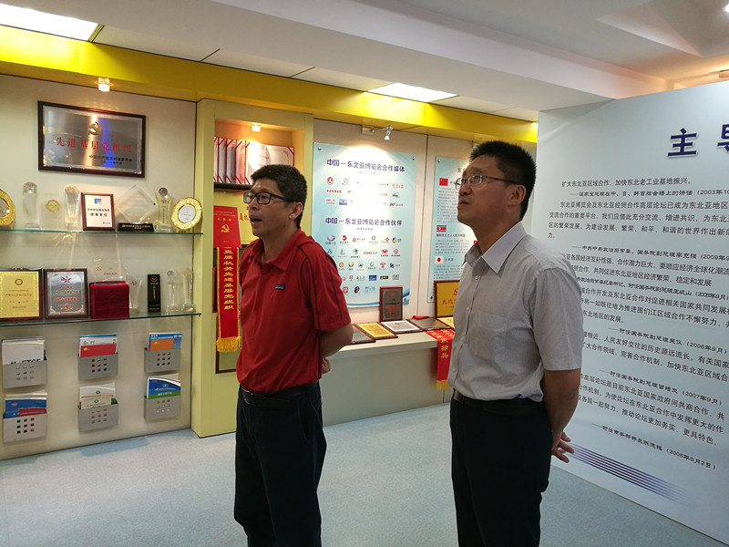 段益民副会长(右)在吉林省贸促会赵强华会长(左)陪同下,参观 “中国-东北亚博览会”成果展