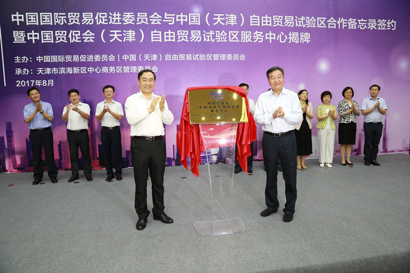 根据《中国国际贸易促进委员会与中国(天津)自由贸易试验区管理委员会合作备忘录》,中国贸促会今后将与天津自贸试验区管委会共同努力,在促进对外贸易投资、开展国际交流合作、提供涉外商事法律服务、联合开展研究工作等方面携手合作,为自贸区企业“走出去”提供便利化服务。双方还将加强会展资源整合,培育壮大市场主体;合作举办会展人才培训,共同促进天津自贸试验区会展业和全国会展业改革发展。姜增伟会长与赵海山副市长共同为服务中心揭牌,签约揭牌仪式由赵学鸣会长主持。
