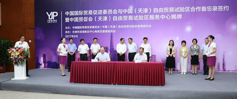 中国贸促会副会长卢鹏起(前排左一)与天津自贸试验区管理委员会专职副主任张忠东(前排右一)代表双方签约
