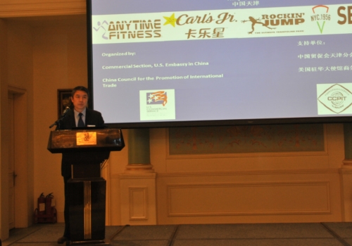 赵峰副巡视员在致辞中指出,中美经贸合作增长迅速,合作领域及合作模式不断增加。随着我国人民生活水平的日益提高,餐饮与健身业受到了广泛关注,大家对健康与锻炼更加注重,此次活动举办的恰逢其时。希望此次活动的举办可以让更多的天津企业了解这些品牌,继而开展合作。天津贸促会将继续携手美国驻华大使馆商务处,为两国企业搭建交流平台,共同促进天津市与美国的经贸发展,不断开拓双方互利共赢的新局面。