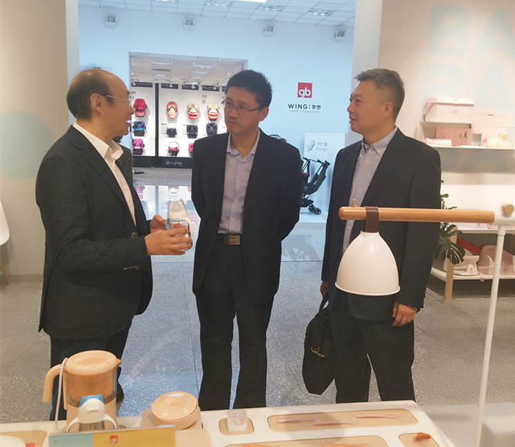 宋郑还主席(左)向段益民副会长(中)介绍好孩子集团情况