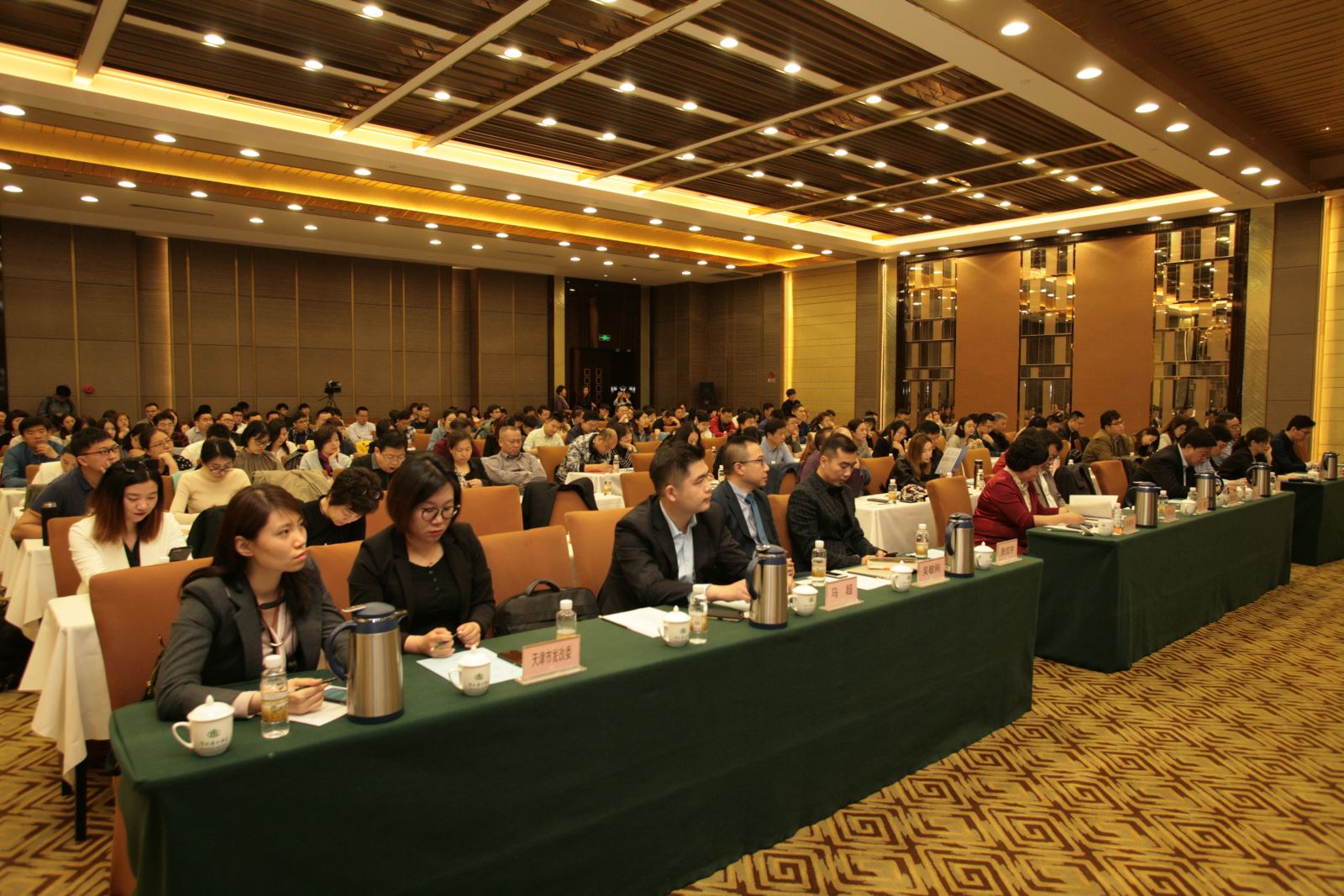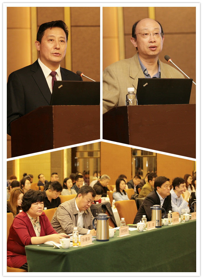 戴胜国副巡视员致辞(左上)、王健教授主旨发言(右上)会议现场(下)