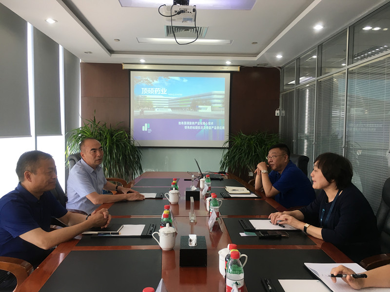 天津顶硕药业股份有限公司许荧董事长(右一)向祖大祥会长(左一)介绍企业情况