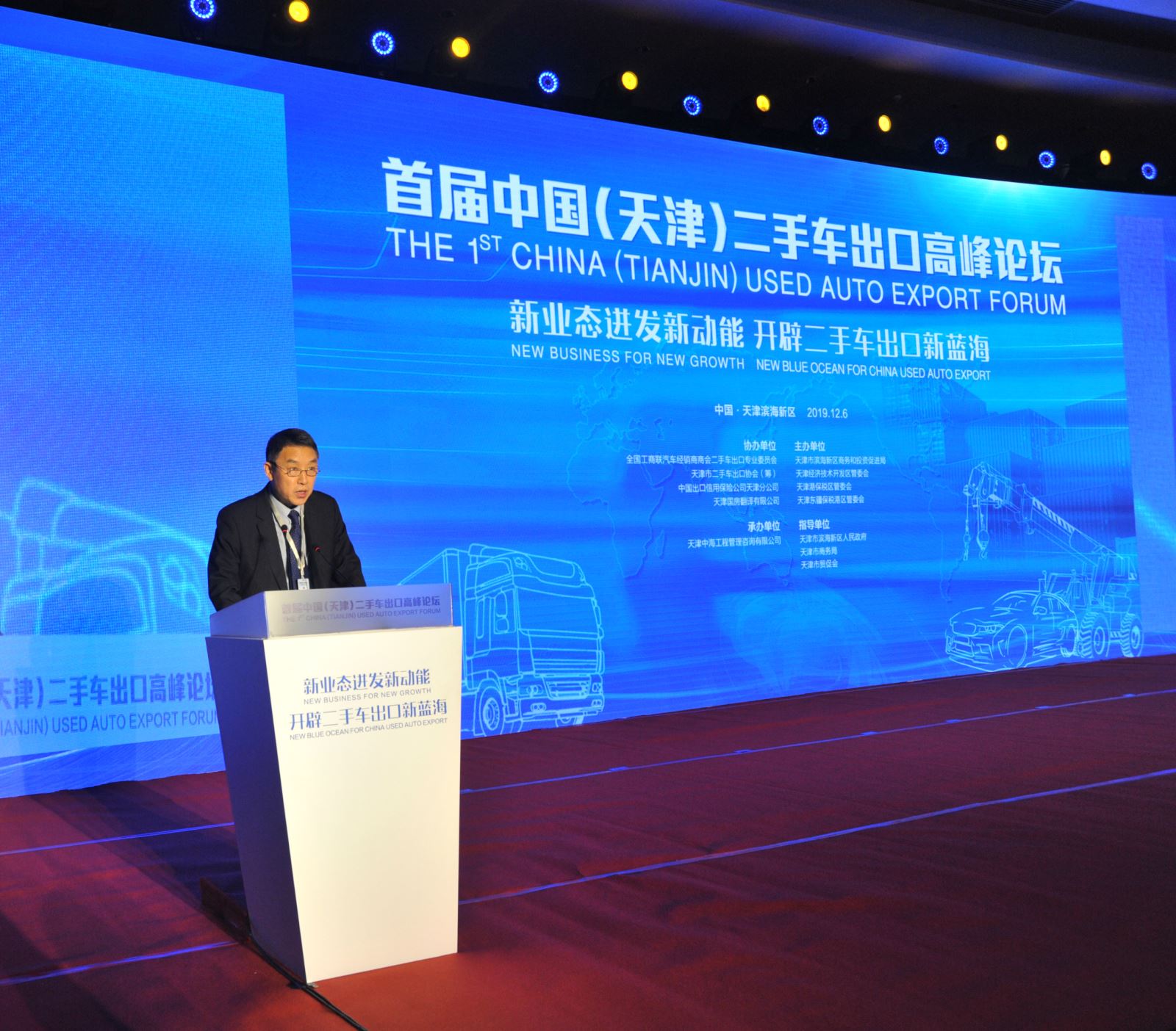 12月6日,“首届中国(天津)二手车出口高峰论坛”在滨海新区圆满举行。赵峰二级巡视员参会并致辞,部分驻华使馆及工商机构代表与来自全国二手车出口企业代表约800人参会。