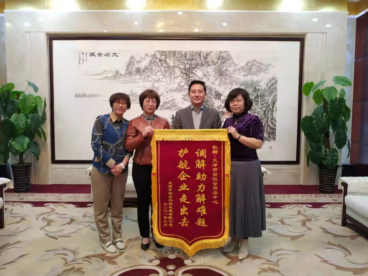 2021年4月2日,天津市裕昌科技发展有限公司刘利平副总经理一行专程拜访我会并赠送“调解助力解难题,护航企业走出去”的锦旗,感谢我会商法中心专业高效的法律服务。戴胜国二级巡视员、商法中心相关负责人接待来访客人。