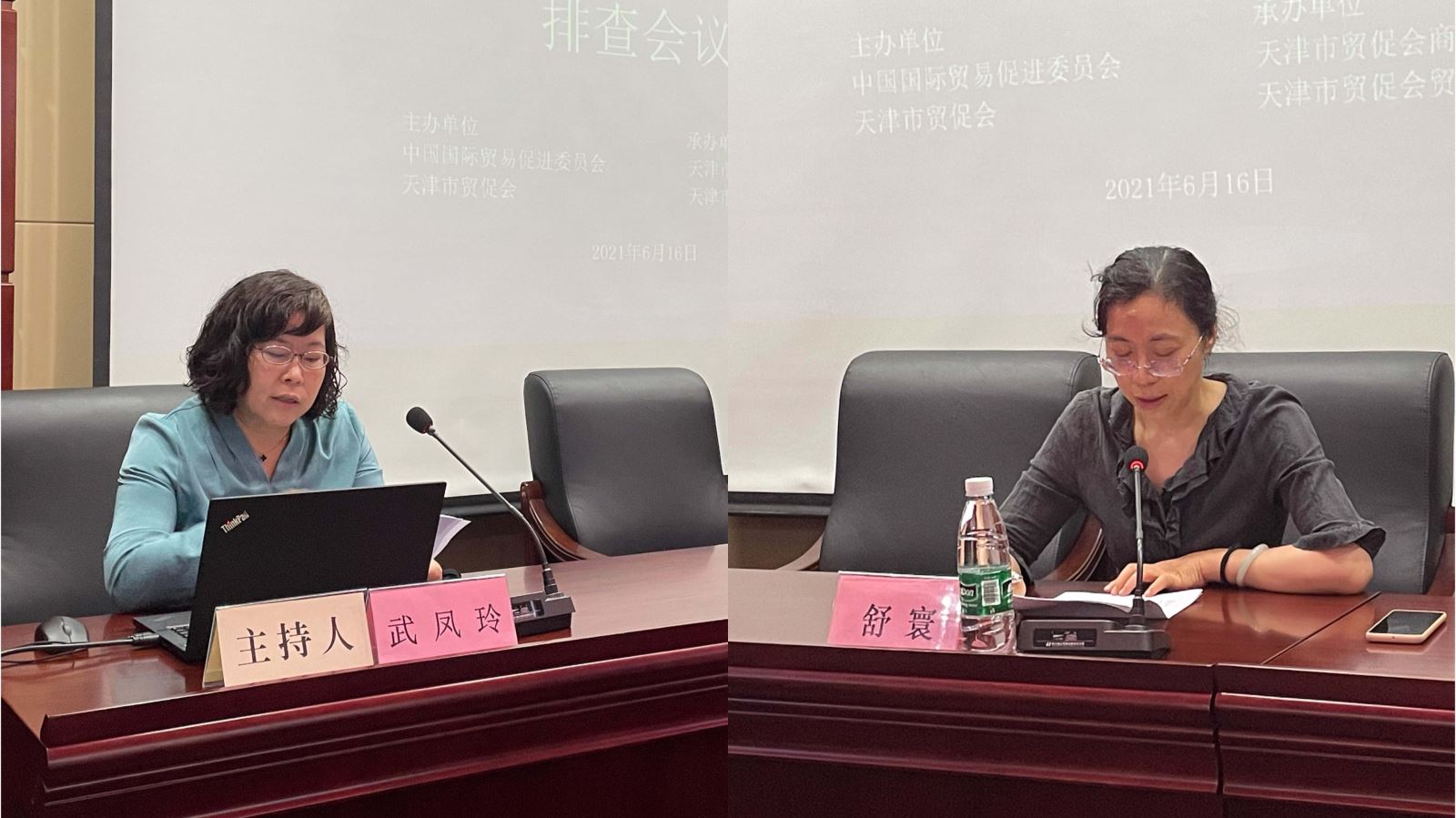 中国贸促会法律事务部舒寰副部长致辞(右)我会商法中心武凤玲主任主持会议(左)