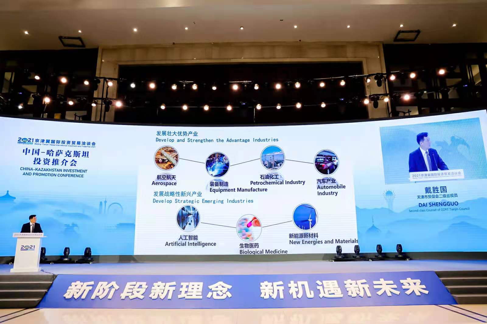 在配套活动中国-哈萨克斯坦投资推介会上,戴胜国就天津对外合作需求情况进行了推介,表示天津将在发展壮大高端装备、汽车、石油化工、航空航天、生物医药、现代中药、高端医疗器械等优势产业及推动冶金、轻纺等传统产业高端化、智能化、绿色化升级等方面谋求高水平合作。