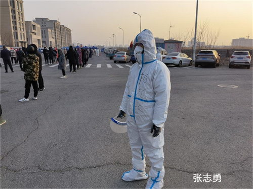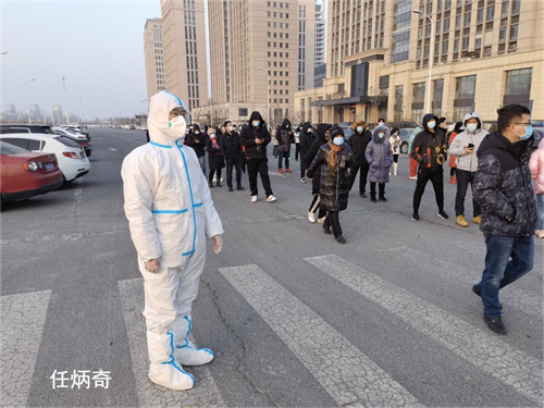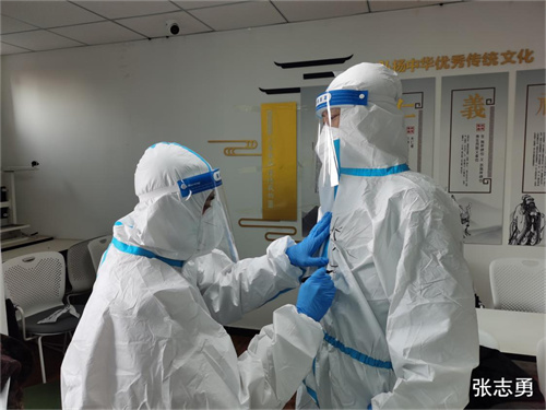 16日,根据工作安排,张志勇等4人赶赴辛庄镇,进入封控区执行隔离人员上门核酸检测任务,展开“敲门”行动。虽然进入最危险的“红区”,但他们毫无畏惧,充满斗志。做好二级防护后,2名医务人员和2名下沉干部组成一个战斗小组,开始逐层“扫楼”。