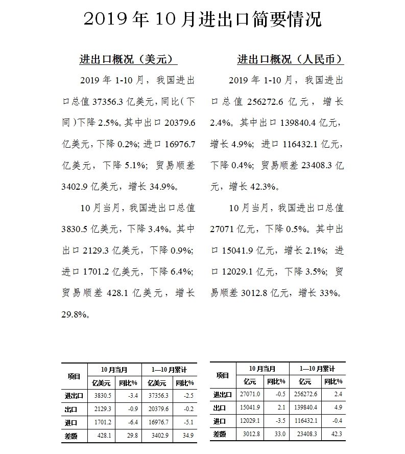2019年前10月进出口简要情况