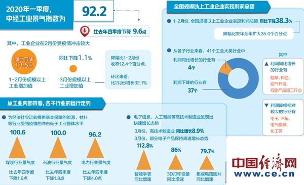 一季度,中经工业景气指数为92.2,比去年四季度下降9.6点。受国内新冠肺炎疫情突发、春节假期延长、国外疫情蔓延等多种因素叠加影响,工业景气水平出现较大幅度回落。其中,工业企业在2月份受疫情冲击较大,1-2月份规模以上工业增加值同比下降13.5%。