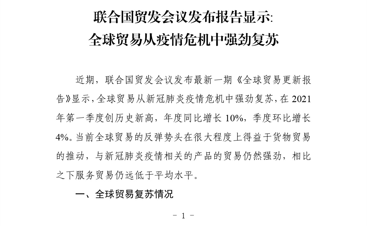 贸促工作参考——联合国贸发会议发布报告显示全球贸易从疫情危机中强劲复苏