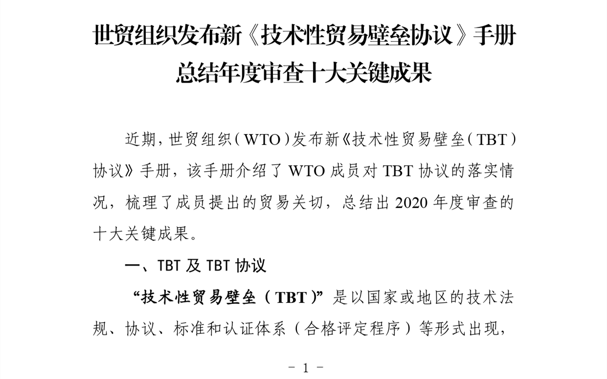 贸促工作参考——世贸组织发布新《技术性贸易壁垒协议》手册 总结年度审查十大关键成果
