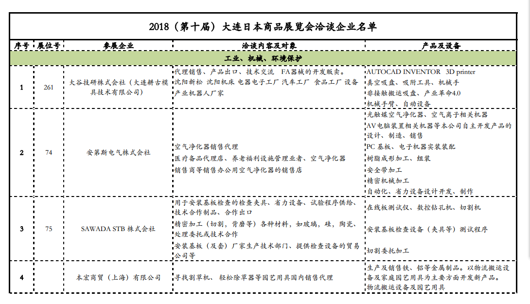 2018大连日本商品展览会将于2018年9月21日-23日在大连世界博览广场举办,届时将有工业制造、工业用品、农产品、食品饮料、日常生活用品、服务业等领域的日本企业和机构到大连参展,现诚邀各相关单位积极参会洽谈。