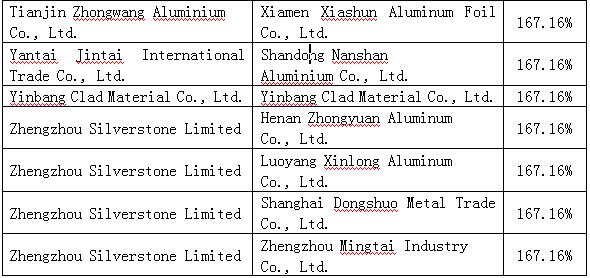 2018年6月18日,美国商务部宣布对进口自中国的铝合金薄板(Alloy Aluminum Sheet)作出反倾销初裁,初步裁定:强制应诉企业河南明泰铝业股份有限公司(Henan Mingtai Al Industrial Co., Ltd.)和郑州明泰实业有限公司(Zhengzhou Mingtai Industry Co.,Ltd.)、南杰资源有限公司(Nanjie Resources Co., Limited)、永杰新材料股份有限公司(Yong Jie New Material Co., Ltd.)、浙江永杰铝业有限公司(Zhejiang Yongjie Aluminum Co., Ltd.)、Zhejiang GKO Aluminium Stock Co., Ltd.、获得单独税率的企业(详见下表)以及中国其他企业倾销率均为167.16%。美国商务部预计将于2018年10月30日对此案作出反倾销终裁。