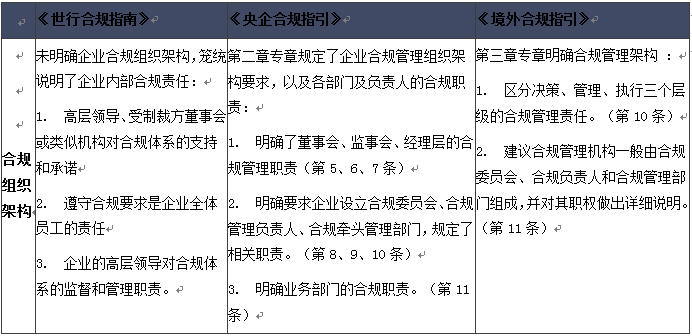 在合规组织架构方面,《世行合规指引》与《央企合规指引》、《境外合规指引》存在较大的区别。《世行合规指引》并未明确企业如何构建合规组织架构,仅规定了企业领导层和公司各级员工的合规责任;《央企合规指引》、《境外合规指引》则对企业的合规组织搭建作出了较为明确的说明。