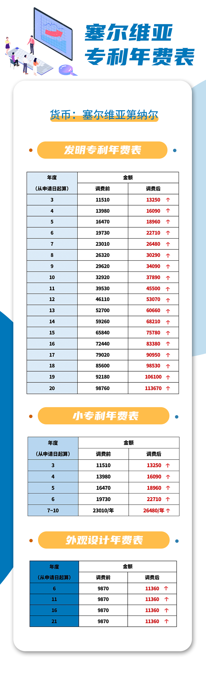 自2023年7月1日起,塞尔维亚上调了其专利相关费用,下图为最新塞尔维亚专利年费表:
